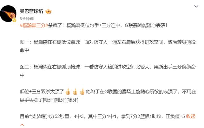 杨瀚森在G联赛又打出一场完美的球,全场比赛20+7+7,他直接登上了国内的热搜榜,作为现役中国男篮唯一一个在NBA打球的球员,中国球迷们都很关注他的表现。