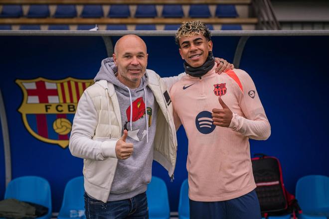 巴萨官方晒照,俱乐部传奇伊涅斯塔在周四造访训练基地,并与亚马尔、佩德里等人合影留念。